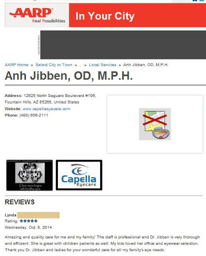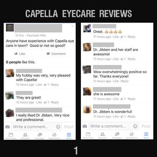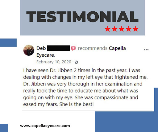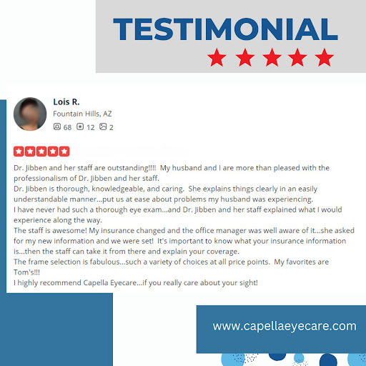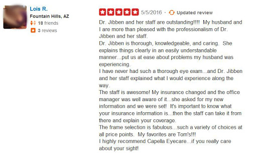 I was on a business trip while in Phoenix area and found this place since it was near the resort where i was staying. So i scheduled an eye exam because i have been having headaches eye strains and dry eyes so figured it had to do with my glasses i have been wearing for the past 3-4 years. I have checkups every year at OTHER places and they always say its the same -2.50 since that is also what i tell them before the exam. Upon my arrival at Capella, the staff were extremely nice and helped me with a few nice frames that they had on display. On this visit to Dr. Jibben, she gave me the BEST and most comprehensive exam that i have ever received (Full dilated exam). She is extremely knowledgable and explained the reasons for my symptoms. After my checkup, it turns out that the OTHER DOCTORS that i got exams from OVER PRESCRIBED me by a WHOLE diopter, meaning i wasnt a -2.50 but truly only -1.50, so Dr. Jibben explained that i could not simply just back to a -1.50 since my eyes are so accustomed to -2.50 over the years. In the end i walked away with a new pair of fashionable eyeglasses and tons of premium contacts to help my dry eye, and to gradually work my way back down to my true -1.50 prescription. Dr. Jibben`s practice has great value, great selection of nice frames & very professional staff. I am extremely satisfied that i was seen by Dr. Jibben and i would travel from Chicago every year just to get a check up from her and give me a reason to take a short weekend vacation! Dr. Jibben is the BEST!