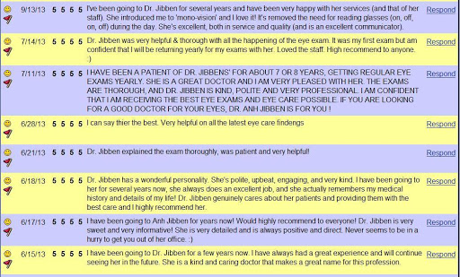 I went to Dr Jibben on a friends recommendation. I found the office very courteous and Dr. Jibben was on time, her exam was thorough and she fixed a problem I had been seeing another Dr for on my first visit. I was impressed, to say the least. she will be my eye Doc from now on.....