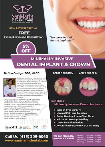 I first visited Dr. Costigan at San Marin Dental with an infected tooth. I was worried and afraid. Also embarassed at having neglected my teeth for so long. Dr. Costigan healed the infection with antibiotics, pulled the tooth, installed a bridge and worked on my sadly neglected gums. Now I am a regular patient at San Marin Dental, going in for cleanings and checkups according to a schedule. As far as I am concerned, Dr. Costigan saved my life; she may well be the greatest dentist on Planet Earth. I also really like the team at San Marin Dental. They are all very nice. Also, efficient and fast. Good people!