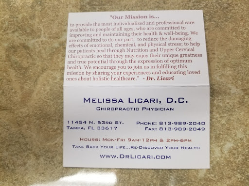 I found the staff to be pleasant and quite helpful. Dr. Licari clearly knows her stuff and has an easy-going way of explaining issues and their solutions. Im a big fan of upper cervical care and I believe Dr. Licari and her staff will be able to help a large number of people through their office. However, Im disappointed on two fronts. The first is that the handheld Laney instrument (the device used to gently nudge the atlas bone back into place, named after the inventor, Dr. Laney) seems less precise to me than the more modern table-mounted adjustment device. Ive been receiving upper cervical adjustments for almost two decades and the table-mounted device has, in my experience, produced accurate adjustments with the first "tap", while the use of the handheld device seems to be to nudge the bone into place with a tap-tap-tap, then check the alignment and tap some more. I will be continuing my search for a chiropractor who uses the table approach, although I admit they are few and far between. The second issue for me was the reluctance to recognize that this is not my first rodeo. The insistence that I sit through a 45 minute "orientation" allowed no flexibility for the situation of a patient thoroughly familiar with upper cervical care already. This is probably a fine approach for people who are new to this form of chiropracty but it is inappropriate for me. In a more general sense, Im not comfortable with a medical professional who appears to disregard 18 years of patient experience and projects a "my way or the highway" attitude. I chose the highway. Your mileage may vary (pun intended). I appreciate that they were willing to work around my chaotic travel schedule (I travel a lot for business). They did seem reluctant to schedule an appointment later than 4pm though, even though they claim office hours run through 6pm. I believe they budget an hour for each appointment and then the doctor uses the last hour to review X-rays taken during the day (this is typical for chiropractors). Perhaps office hours should be advertised as running through 5pm instead? As I said above, I found the staff to be quite personable and I wouldnt hesitate to recommend this office in general, but for me they werent a good fit.