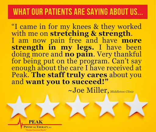 I really like this place. I love it because Jeff and Jacque always make it so fun while Im doing my exercises. Jeff and Jacque are wonderful people and have helped me progress so much, also they are so nice. Everyone that needs to go to physical therapy needs to come to Peak Physical Therapy in Middleton you will love it here:)