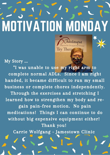 Chautauqua Physical Therapy worked with me to get the pain and weakness out of my right shoulder. The exercises they gave me, Im still using and Im mostly pain free - Thank you!!