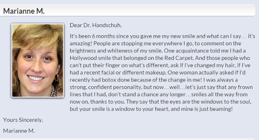 It took me a while before I wrote this review (busy traveling) but Ive been to many dentists throughout my life for multitude of reasons in regards to my teeth and I can honestly say that Dr. Handschuh is by far the best overall dentist Ive seen. The knowledge and professionalism of Dr. Handschuh and staff was remarkable. The main reason why I decided to stay with Dr. Handschuh before deciding on a cosmetic fix up, were the options that were provided to me. He was genuinely concerned about what I thought. I met with a few other professionals before deciding and the options werent there, I didnt feel comfortable, as if I was just one of many. If youre looking for a professional who genuinely cares about their clients needs, I promise you wont be disappointed. Will be going back as well as recommending family/friends.