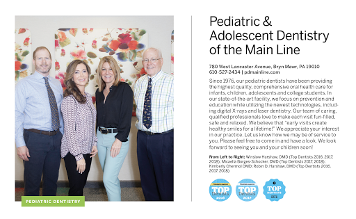 Weve been consistently and thoroughly impressed with our visits to Pediatric and Adolescent Dentistry of the Main Line! Weve had the pleasure of seeing all the doctors in the practice and many of the techs-- and we havent met one that we wouldnt rate as 5 star. I have 4 kids and we travel to Bryn Mawr from Malvern because the care here is so great. We started out at another dentist who was listed as a top dentist in the Philadelphia area, but this practice blows that original dentist away. My oldest child had a pretty complicated cavity between his two front teeth from reflux when he was little- the opinion we got from the original dentist was just to pull the two teeth and wait a few years for the adult teeth to grow in. We opted to go outside the practice and look for a second opinion, which is how we ended up talking to Win Harshaw. He and his team came up with a treatment plan, executed it to perfection, and was able to save my kids teeth. It may not seem like a big deal, but when your child is still learning how to talk, its huge! Weve eventually switched all our kids over and have been very happy ever since.