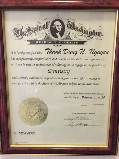 Dr. Nguyen has been my dentist since 2000--almost half my life! Shes the best dentist and I recommend her to everyone. She really cares about her patients and shes very thorough. Shell ask you about what else is going on your life and health to determine if theres any connection with your dental health. Shes the only dentist I know who checks your blood pressure too. There are some dentists who you feel like youre getting sold services. You can speak frankly with her about the costs of services and sometimes shell just tell you. She understands services can be very expensive. You wont get sticker shock. She also uses high-tech equipment too. Her staff is also very caring and considerate. My dad goes to her too. Shes a born teacher too, so shell explain to you what is happening with your teeth, why, and what it means for the long-run.